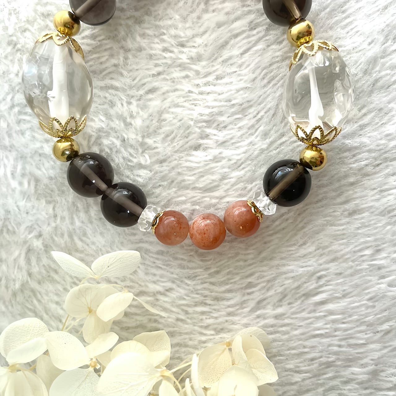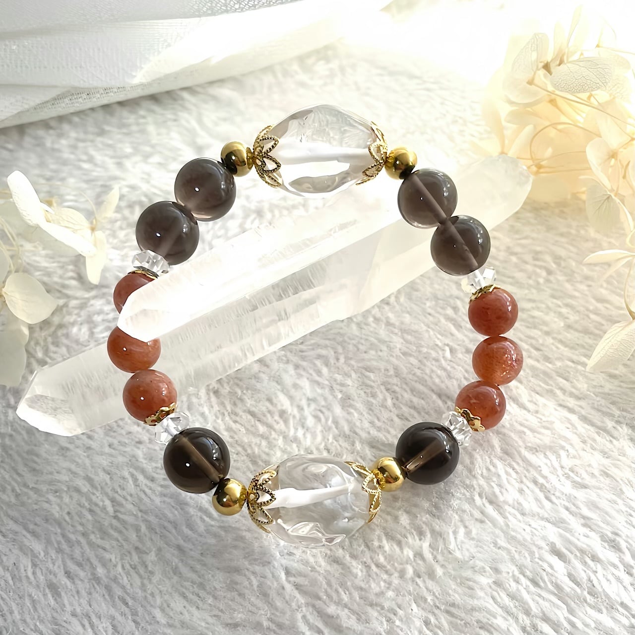 万能石である大ぶり水晶と、太陽の石として有名なサンストーン、グラウンディング力のあるスモーキーを紡いだ存在感のあるブレスレット。