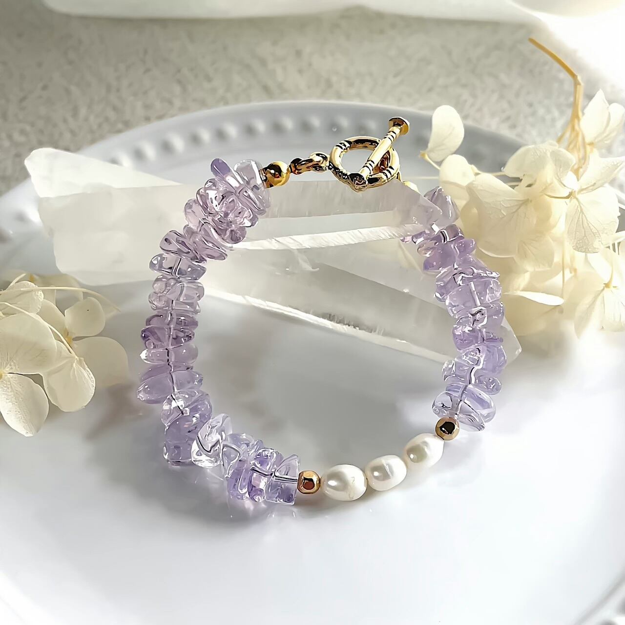 柔らかく優しい色味のスコロライト(ラベンダークォーツ)と、女性を守護すると伝えられている淡水パールで仕立てたデザインブレスレット。